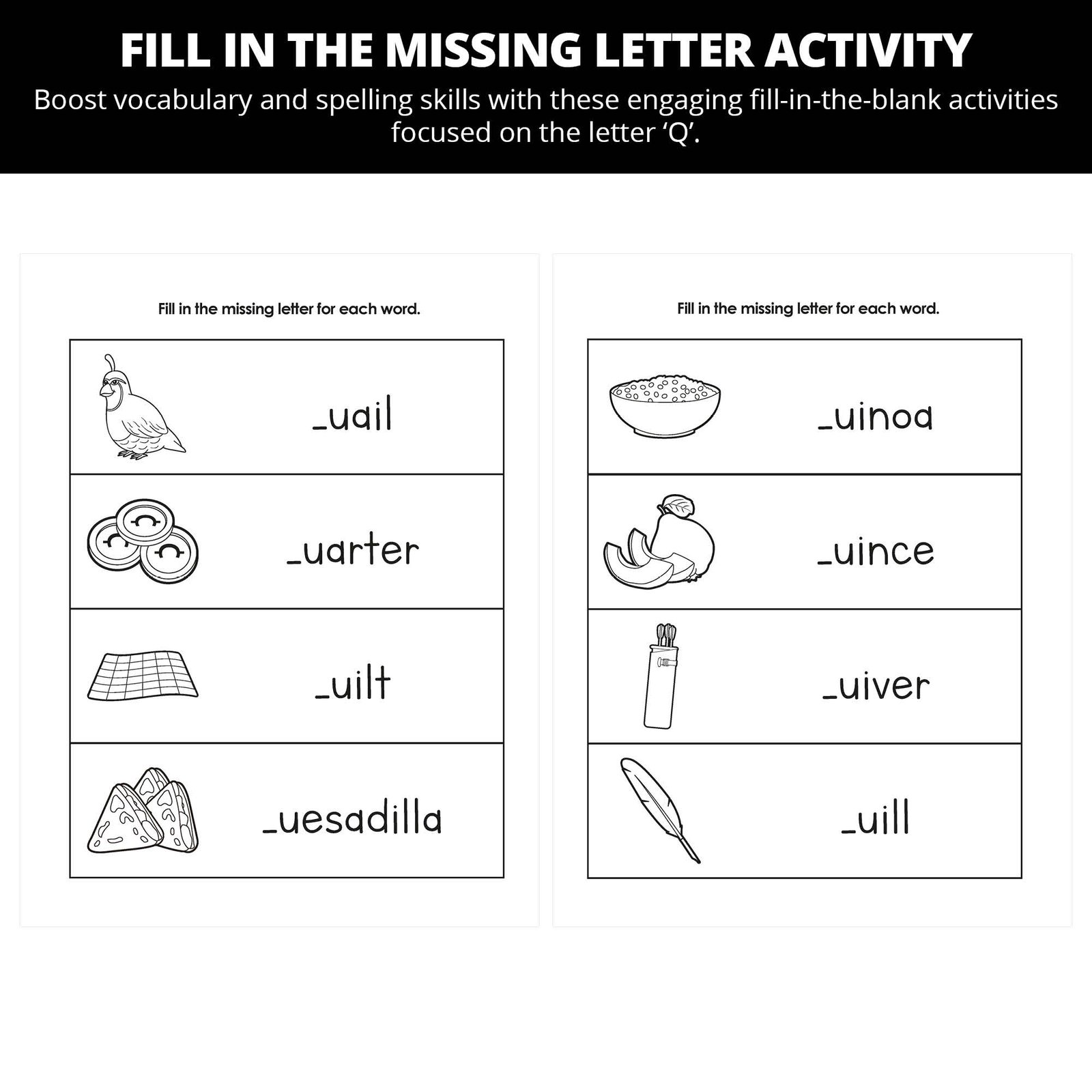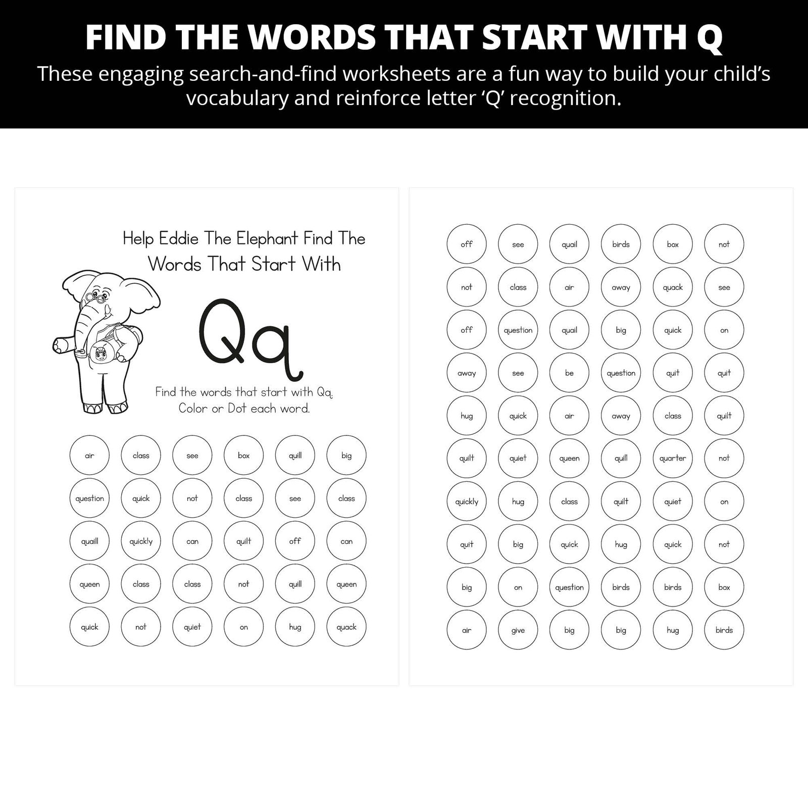 - Find, dot, and color “Q” words with engaging, story-linked illustrations (quail, quilt, quesadilla, and more!).