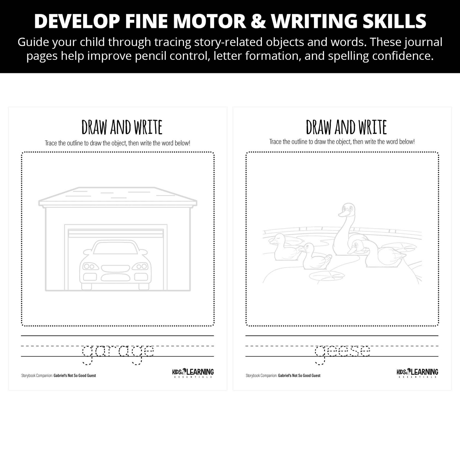 - Draw & Write tracing prompts—kids illustrate and label their own garage, geese, garden, Gabriel, and more