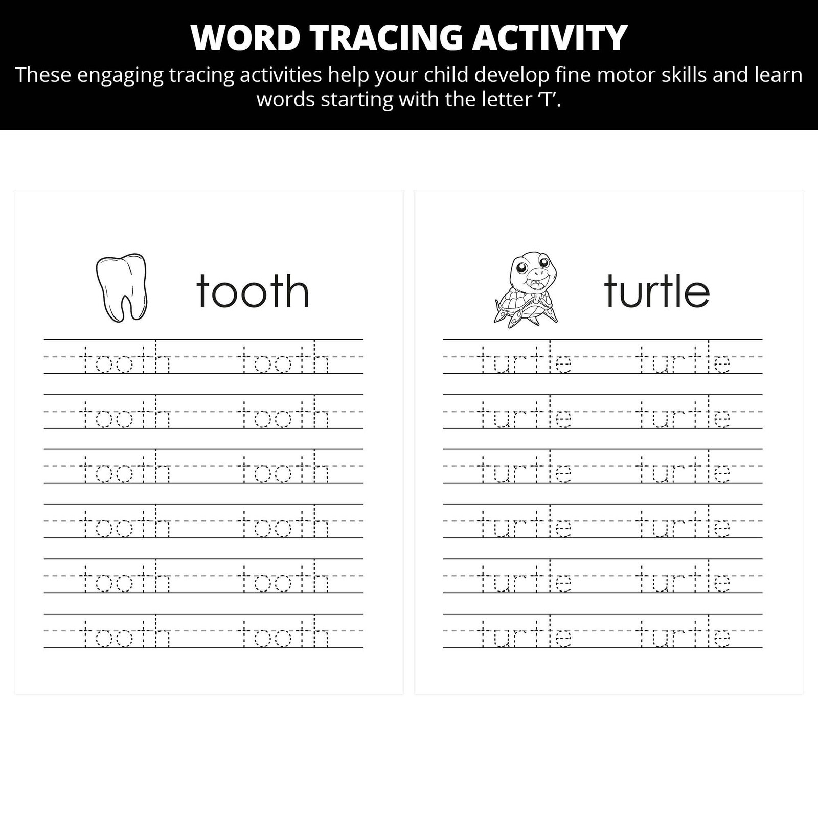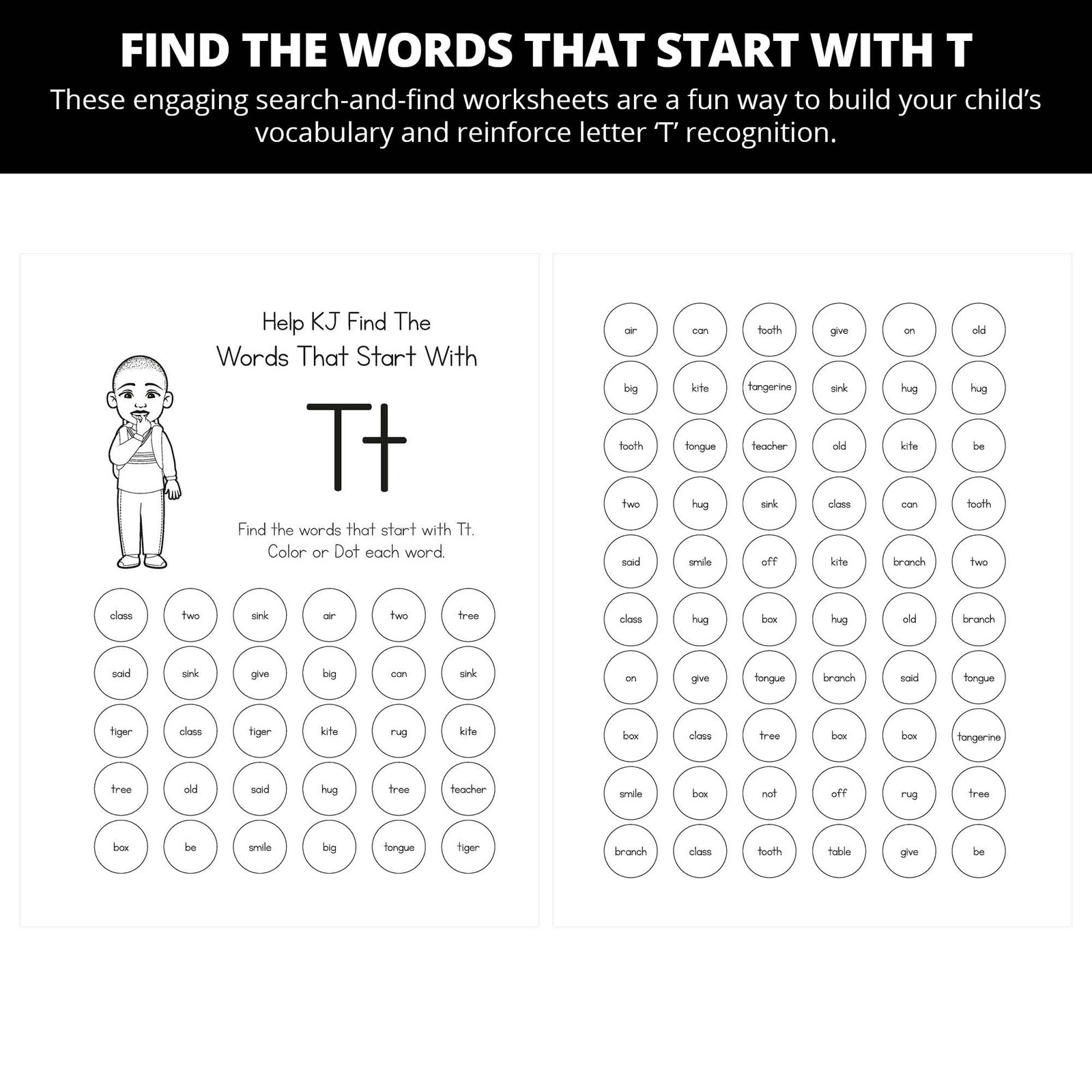 – Trace and write both uppercase and lowercase Tt – Findcirclecolor, and match Tt words and pictures (like “tooth,” “tiger,” “teacher,” “turtle,” “taffy” and more) – Fill-in-the-blank, mazes, and “find the T” games build focus and problem-solving—not just rote memorization.